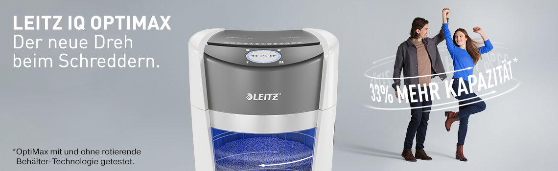 Mit dem LEITZ OptiMax erhalten Sie einen Aktenvernichter, der nicht nur durch seine technische Raffinesse überzeugt, sondern auch durch seine Benutzerfreundlichkeit und das elegante Design. Dank des rotierenden Behälters können Sie bis zu 33% mehr Papier vernichten, ohne den Behälter leeren zu müssen. Die Beleuchtung des Behälters erleichtert die Kontrolle des Füllstands und vermeidet unnötige Unterbrechungen.
