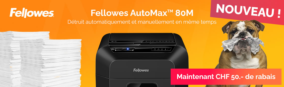 Rien n'est plus synonyme de destruction efficace dans un bureau à domicile que le nouveau destructeur AutoMax 80M de Fellowes, car ce nouveau destructeur automatique hybride détruit simultanément 80 feuilles automatiquement et 8 feuilles manuellement. Détruisez vos documents, agrafes, cartes de crédit et trombones en un clin d'œil grâce à ce destructeur puissant et simple d'utilisation.