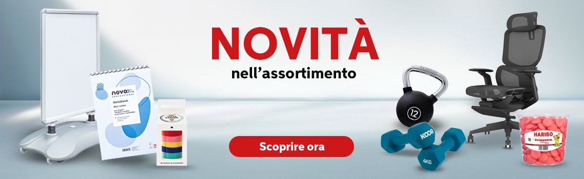 Se ordinate entro le ore 17, riceverete i vostri articoli gratuitamente e già il giorno successivo. Per ordini a partire da CHF 100.− (IVA esclusa) vi regaliamo il supplemento per piccoli ordini del valore di CHF 9.50. Inoltre, a ogni acquisto di articoli per l'ufficio riceverete automaticamente il nostro miglior prezzo garantito, con la certezza che pagherete sempre il prezzo più basso in assoluto. A partire da un determinato fatturato, approfitterete anche del nostro programma fedeltà – Profit System – che prevede numerosi vantaggi. Il nostro assortimento convince grazie a una equilibrata combinazione tra marchi locali e internazionali, completata da nostri marchi convenienti.