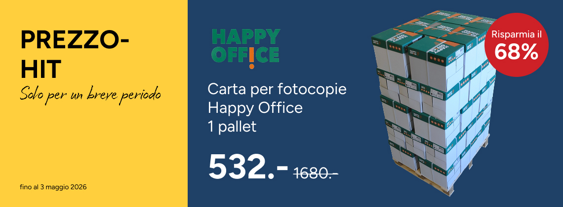 Se ordinate entro le ore 17, riceverete i vostri articoli gratuitamente e già il giorno successivo. Per ordini a partire da CHF 100.− (IVA esclusa) vi regaliamo il supplemento per piccoli ordini del valore di CHF 9.50. Inoltre, a ogni acquisto di articoli per l'ufficio riceverete automaticamente il nostro miglior prezzo garantito, con la certezza che pagherete sempre il prezzo più basso in assoluto. A partire da un determinato fatturato, approfitterete anche del nostro programma fedeltà – Profit System – che prevede numerosi vantaggi. Il nostro assortimento convince grazie a una equilibrata combinazione tra marchi locali e internazionali, completata da nostri marchi convenienti.