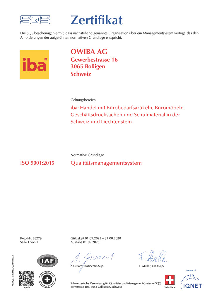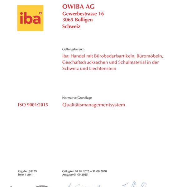 Im August 2025 konnte die iba erneut das Zertifikat nach der Norm ISO 9001:2015 entgegennehmen, welches bis 2028 gültig ist.